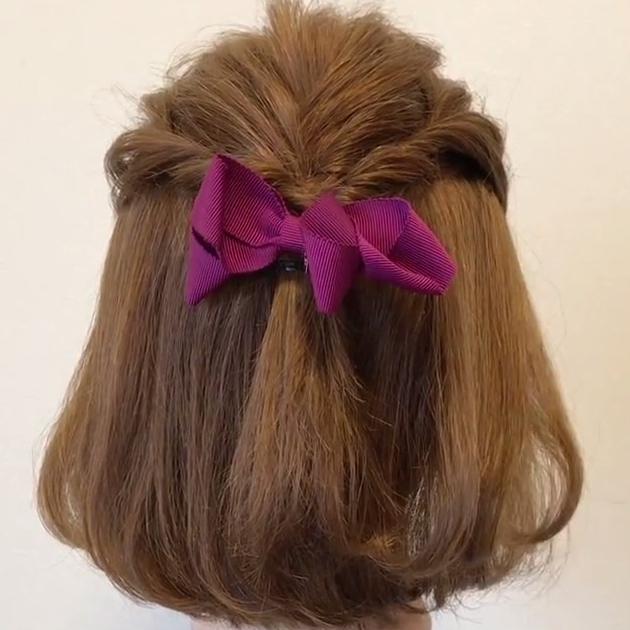 清楚系ヘアアレンジといえば、ハーフアップでしょう!後髪の表面を取り、三つ編みをしてほぐすだけだから、ショートでもかわいくアレンジできるんです。