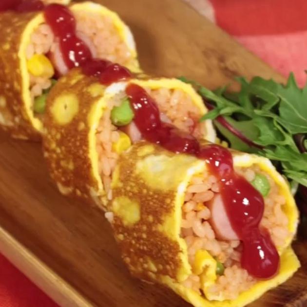 ケチャップライスとソーセージを卵でくるくるっと巻くだけなので簡単に作れますよ。