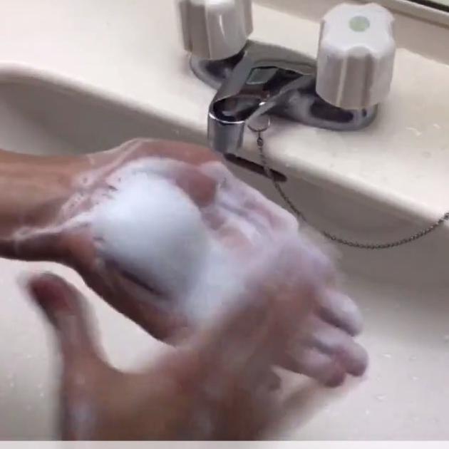 清潔な手を軽く濡らし、枝豆ほどの大きさに洗顔料を出します。手のひら全体に伸ばしたら、水を少しずつ足しながら泡立てていきます。