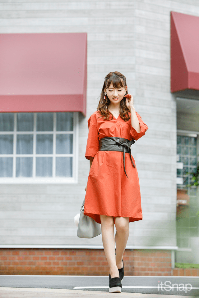 最後にご紹介するのは、鮮やかなオレンジのワンピースを使ったコーデ。ウエストは太めのベルトでマークして、ラインを強調しましょう◎