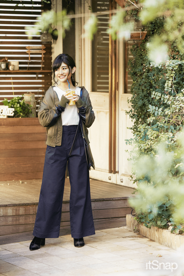 カーキのMA-1で、カジュアルに仕上げたコーデ。ボトムはワイドパンツをチョイスすれば、ラフになりすぎず大人っぽさも出せちゃうんです♡
