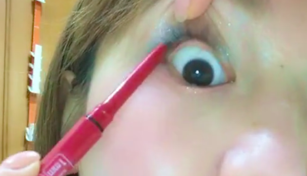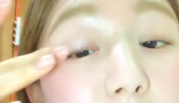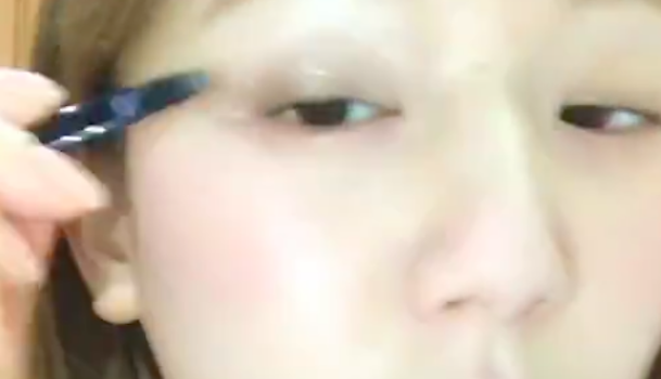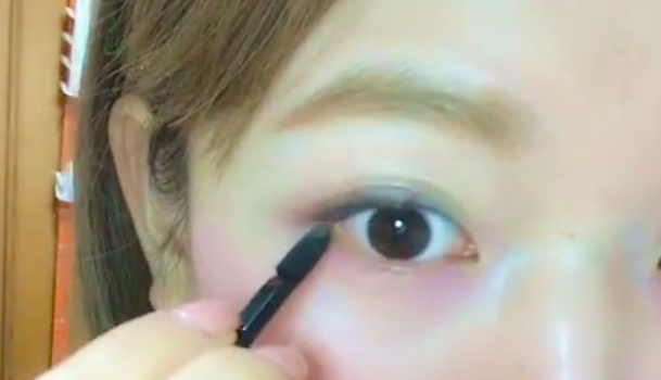 今度はアイラインを引きましょう。片手で上まぶたを引き上げながら、もう一方の手で引いていきます。まつげの生え際全体ではなく、粘膜と目尻のみにラインを引くことで自然な感じに仕上がりますよ♪
