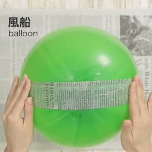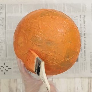 細く切った新聞紙を1の糊に浸し、ふくらませた風船に貼って、まんべんなく貼れたら乾かします。