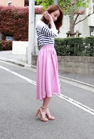 うさぎ系女子の代表的アイテム・フレアスカート。ピンクパープルでとってもかわいらしいですが、トップスにボーダーをあわせることによって少しラフさも出せるんです♪