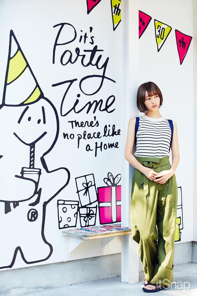 ヘルシーで爽やかな印象を与えるショートヘア。ボーダートップスに、ハイウエストのワイドパンツを合わせて今っぽいマリンカジュアルテイストに仕上げます。