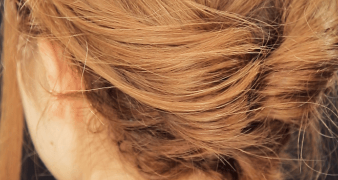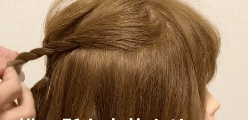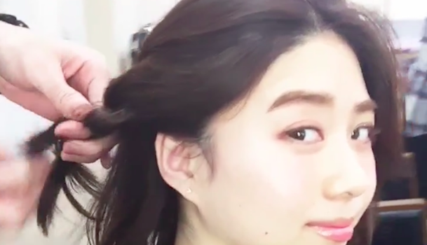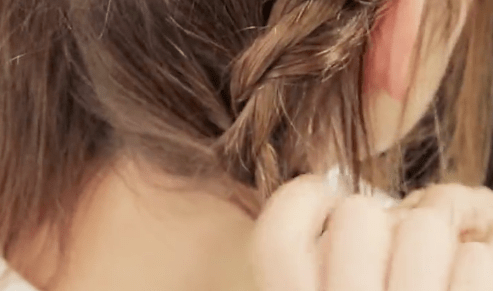 1で残しておいた耳上の髪をとり、ねじっていきます。このとき、2で半分に分けた束から少しずつ毛をとり、一緒にねじっていくのがポイント!