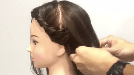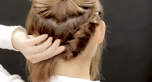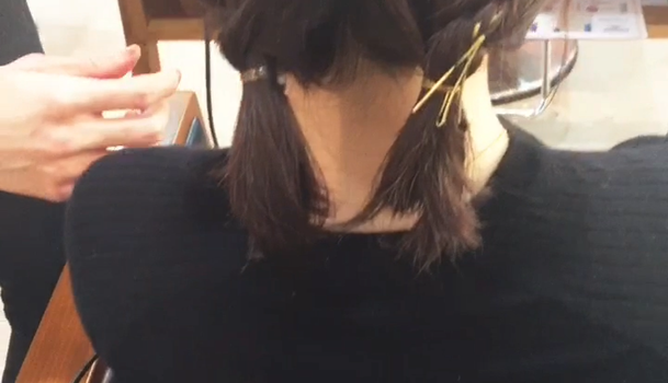 両サイドに残していた毛をねじり、後ろの真ん中あたりまで持ってきます!