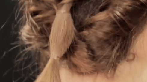結んだら、トップの毛を少しずつ引っぱってルーズな髪型をつくっていきます。