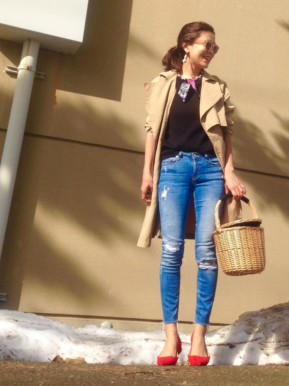 シンプルなベーシュトレンチとダメージデニムでカジュアルダウン。上品すぎない大人っぽさが通勤スタイルにもピッタリですよね♪