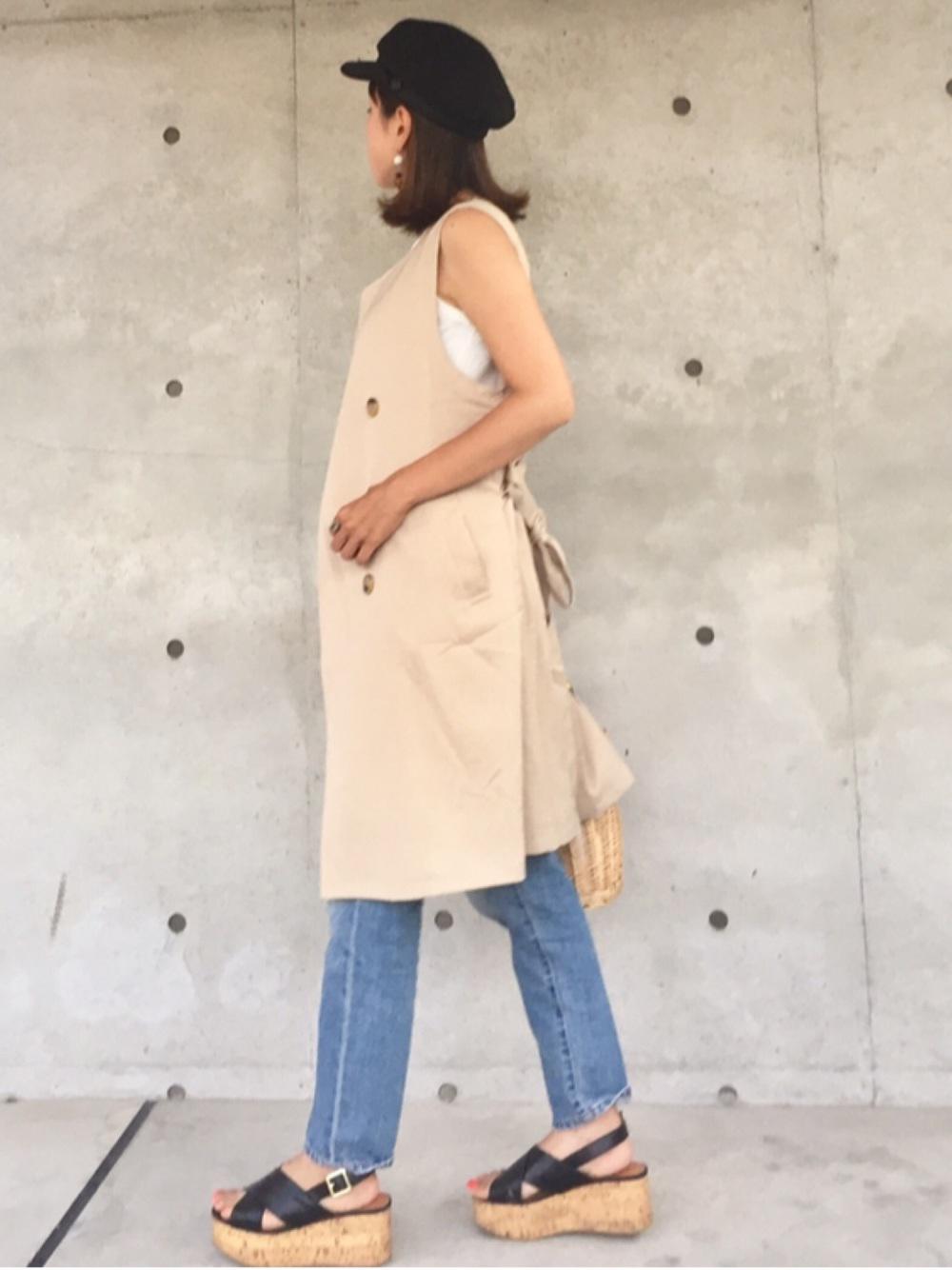 細身のデニムに、ノースリーブのトレンチコートを合わせた大人カジュアルスタイル。縦ラインが強調されてスタイルアップ効果も期待できます。春や秋の初めにぴったりな涼しげコーデですよね♪