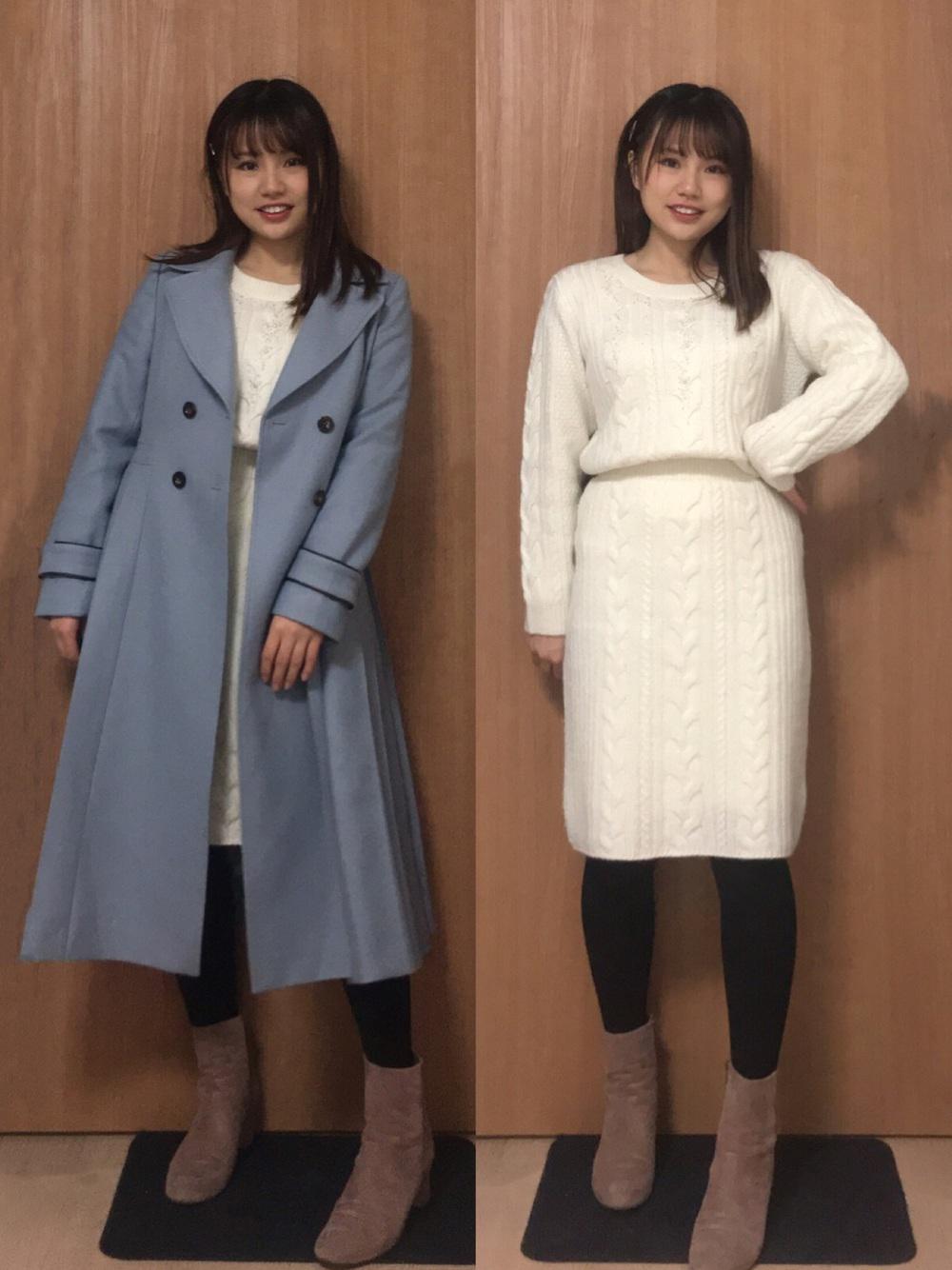 カラートレンチにホワイトのニットアップを合わせた上品なスタイル。寒色系アウターは冬にぴったり♡
