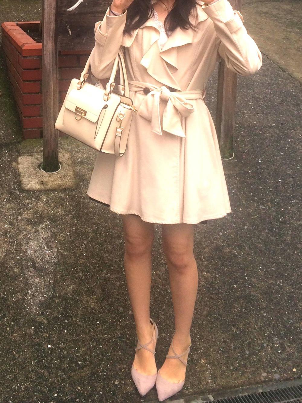 ひざ丈ワンピとベージュのトレンチコートを合わせたコーディネート。ワンピースよりもちょっと丈が長めなアウターとのバランスが最適♪