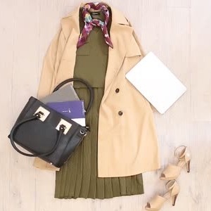 シンプルなニットのセットアップにトレンチコートの組み合わせは、柄スカーフでトレンド感をプラス。小物を加えるだけで、おしゃれなオフィスコーデに大変身しますよね♪