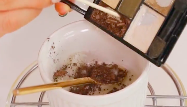 余ったアイシャドウの濃い色を入れます。下からろうそくなどで熱を加えながら溶かしていきましょう。全体が同じ色になるように、よく混ぜてください。