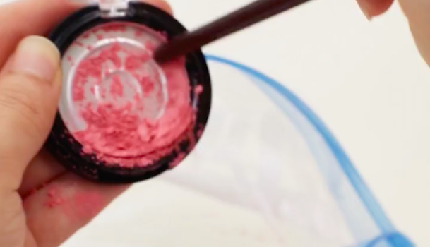 粉チークを筆の軸先で崩し、密閉式ポリ袋に入れます。