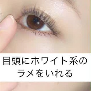 目頭にはホワイト系のラメを入れます。二重幅を締め色で埋めないように注意しましょう!