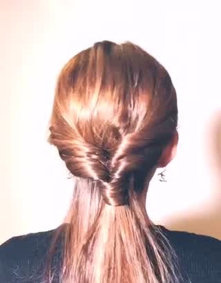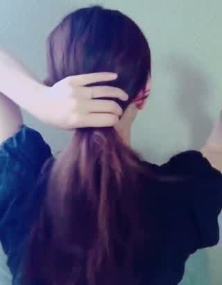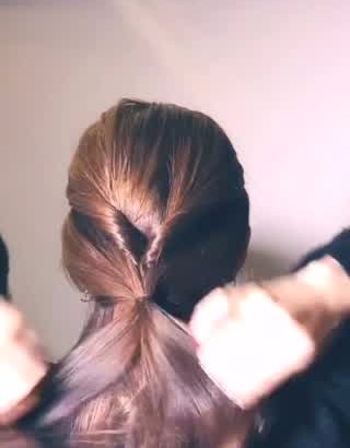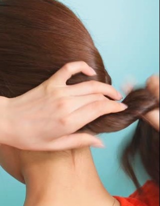 ヘアゴムの上の髪の毛を2つに分け、出来たすきまにポニーテールを通します。上から下へ、ポニーテールがくるんと一周するようにしてください。結び目近くの髪がねじれたようになったら成功です!