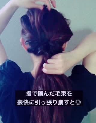 続いて、ルーズ感を出していきます。くるりんぱをしてねじれた部分の毛をちょっとずつ引き出しましょう。ほどよいボリュームが出せたらOKです。