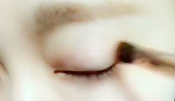 ピンクのリキッドアイライナーを使って、目尻側にラインを引きます。目尻から黒目の終わりのあたりまで、ラインを引いていきましょう!
