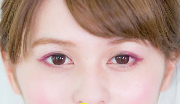 ピンクのリキッドアイライナーを引きます。黒目の終わりのあたりから目尻まではまつげに沿って引き、目尻から先は跳ね上げるように数ミリのラインを引きましょう。