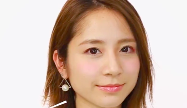 赤みのあるピンク色のチークをブラシにとり、小鼻から目尻にかけて斜めにのせていきます。クールな印象に仕上げるために、あまり濃くつけすぎないよう注意しましょう。広く薄くつけるようなイメージで!