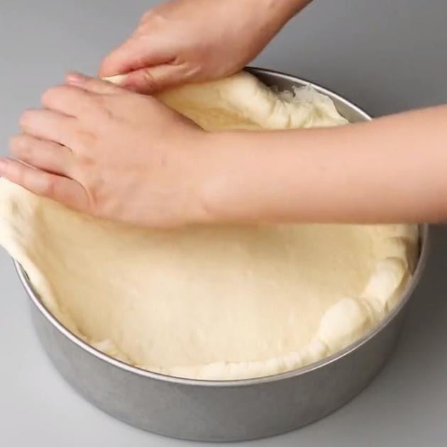 残りの具材をトッピングしたら、ピザ生地の型からはみ出た部分を中に折りこみます。