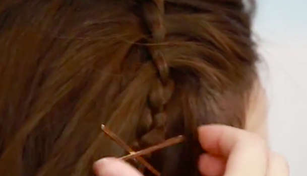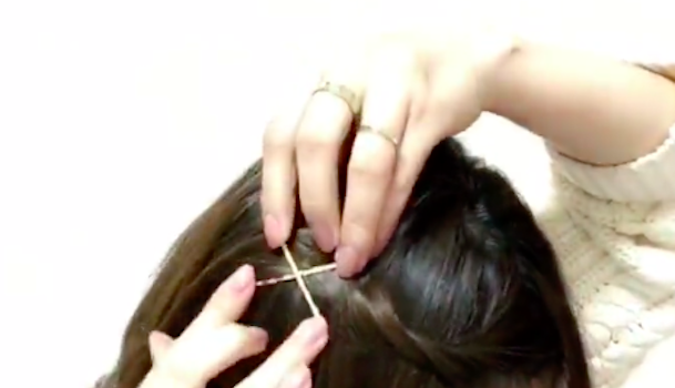 最後にピンでとめます。この時、生え際のあたりが少しふんわりするようにとめるのがポイント。使用するヘアピンは無地のものでも大丈夫ですが、ゴールドピンでバッテンどめにするとよりオシャレ度がアップします♪
