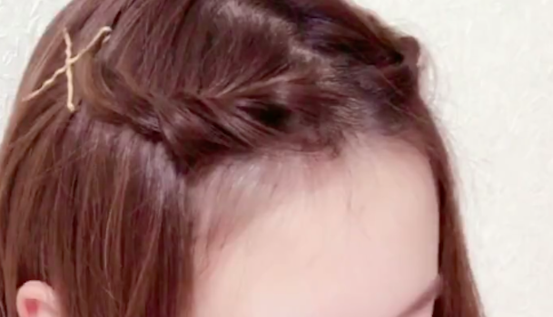 まずはセンターの前髪をねじり、トップのあたりでとめます。ヘアピンは無地のものでOK。