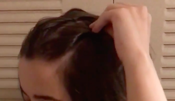 手順2で2等分した毛束をねじりながら後ろにもっていきます。