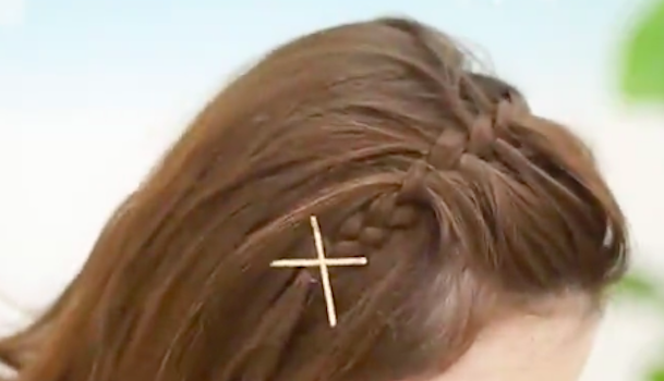 三つ編み部分をゴールドピンでバッテンどめにしたらできあがり。通した前髪が落ちてしまうのが不安な方は、毛先を目立たないピンで固定しておくことをオススメします。