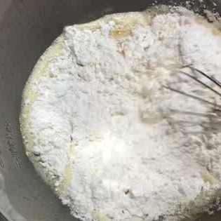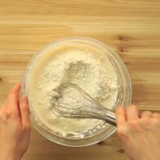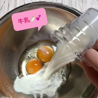 よく混ぜた卵と牛乳に、砂糖とホットケーキミックスを加えて混ぜましょう。