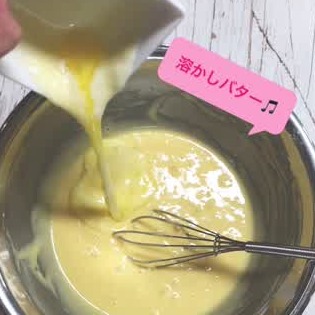 最後に溶かしバターを加えて混ぜます。溶かしバターを入れることで、生地が焼き上がったときにしっとり、なめらかになりますよ♪