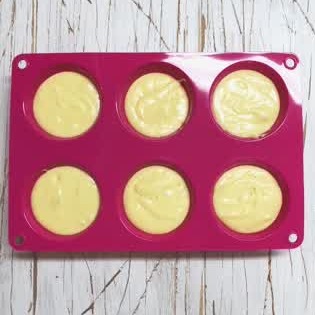 生地の量が均等になるように、型に流し入れましょう。生地が余ってしまった場合は、耐熱カップなどの別の容器にいれてもOK!トッピングをする際は、この工程でするといいですよ◎