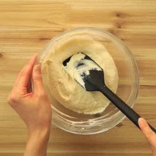 豆腐にホットケーキミックスと牛乳を加えて混ぜます。