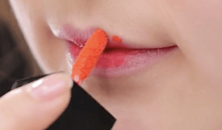唇の中央にリップティントを塗っていきます。この時は濃いリップティントを使うと、あとから見栄えがよくなるのでオススメです!