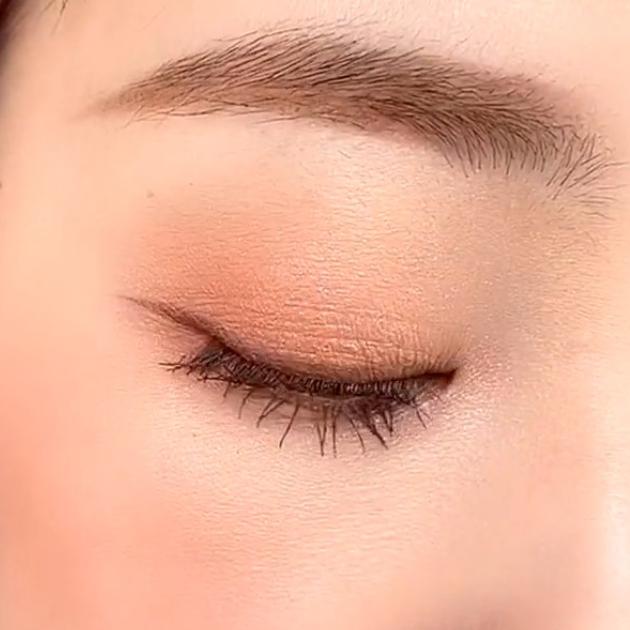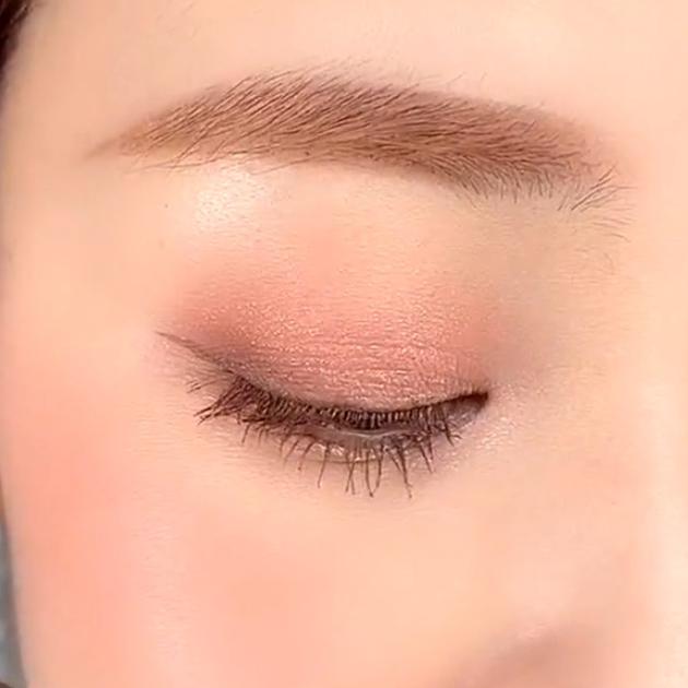 スキントーンのベースカラーに、ピンクコーラルのマットカラー、コーラルのパールグリッターを重ね、最後にブラウンを目のキワに塗れば自然な深みのある目元に♡