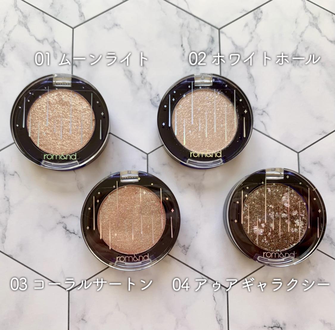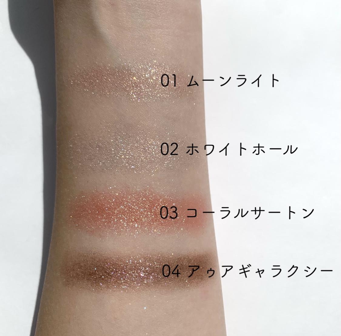 カラーは淡いベージュカラーのグリッター「01 ムーンライト」、クリアベースのグリッター「02 ホワイトホール」、ピーチコーラルのグリッター「03 コーラル・サターン」、濃いブラウンのグリッター「05 アゥアギャラクシー」の4色です♪
