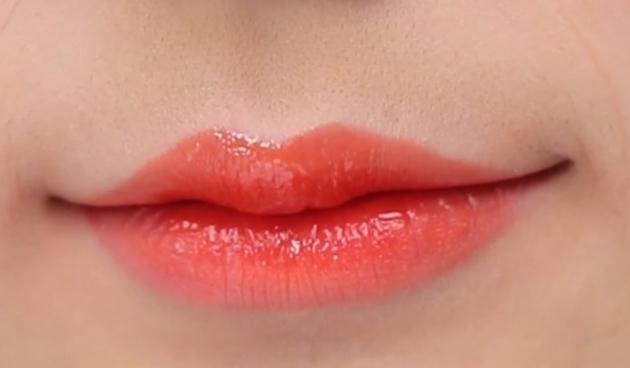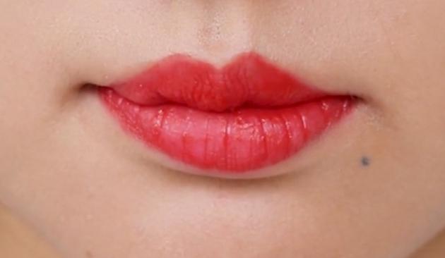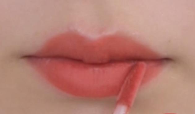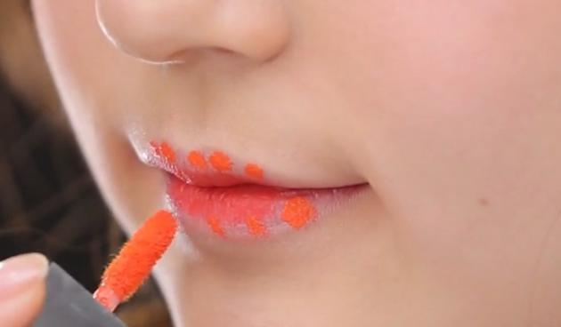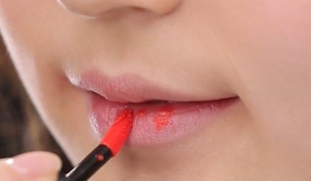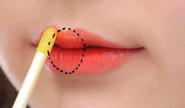 薄いカラーのティントを外側の唇にのせます。そして、綿棒を使って濃いめのティントとの境を馴染ませながらぼかしていきましょう!