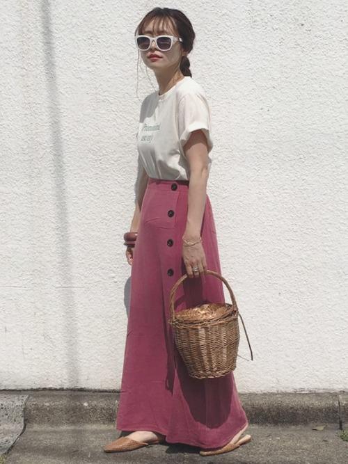 実はこのスカート、上で紹介しているコーデのスカートと色違い!華やかなピンクに変えるだけで、一気に印象が変わりますよね。シンプルな白Tシャツでも人と被らない個性的なコーディネートをしたい人には、ビビッドカラーなどの派手スカートがオススメ!