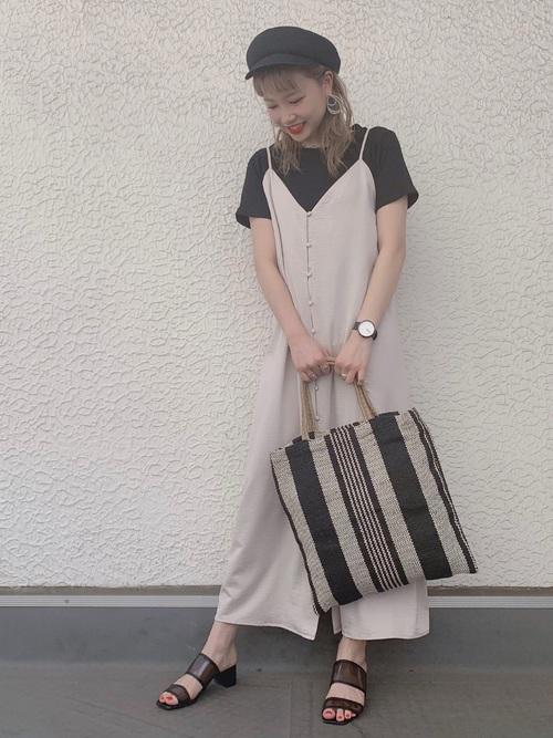 黒Tシャツはワンピースの下に重ね着するのにも大活躍するアイテムです。キャミソールワンピのIラインでスタイルアップ効果も!