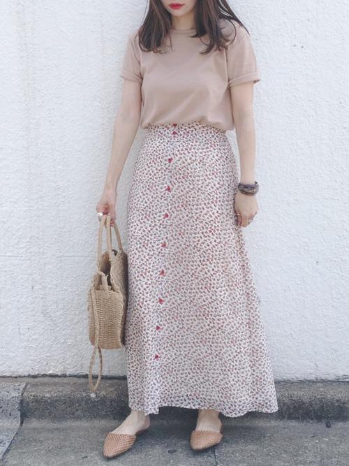 花柄のTシャツにはデニムパンツを合わせて大人カジュアルスタイルに。ウエストマークがスタイルアップ効果抜群!足元に厚底のサボを合わせれば一気に夏らしいコーデになりますよ。