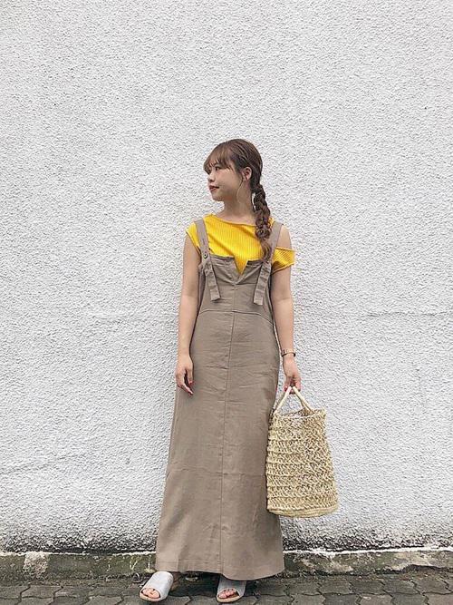 一見合わせるのが難しそうなイエローTシャツは、ワンピースやジャンパースカートを重ねると◎片方の肩が開いた左右でアシンメトリーのTシャツは、ショップでも今季よく見かけるトレンドアイテムです。