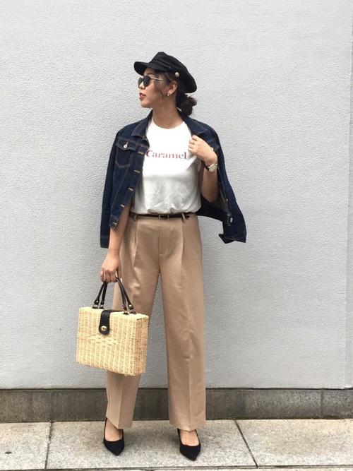 ロゴが赤だとそれだけで差し色に。シンプルなコーデも赤が少しはいるだけで華やかになりますよね!チノパンやデニム、かごバック、キャスケットを合わせればマリン風コーデの完成です。