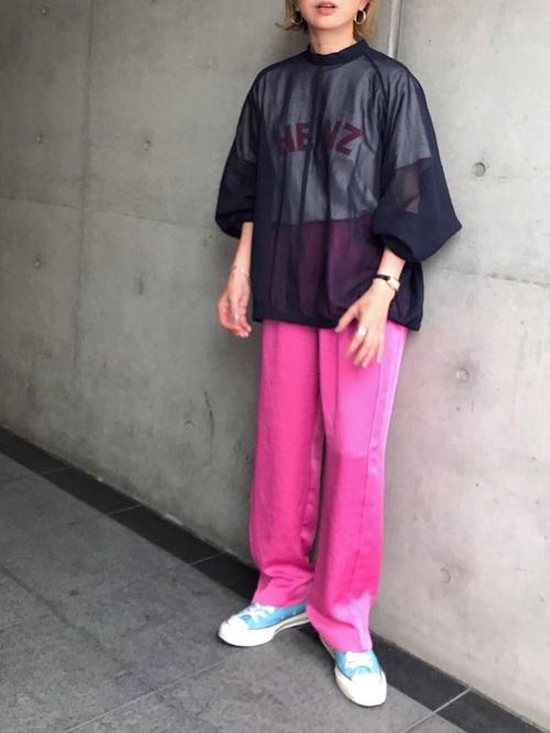 大きめロゴのTシャツにチュール素材を重ねたスタイルも、今季ショップや雑誌でよく目にするコーディネート。少し上級者向けですが、一気にモードでおしゃれな印象になりますよ!