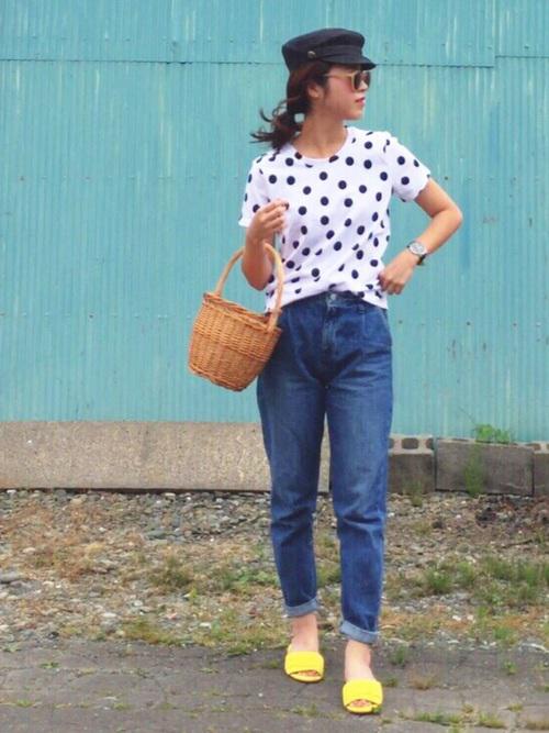水玉Tシャツには定番のデニムを合わせて爽やかコーデに。靴や靴下に色を取り入れるとアクセントになりますよ!水玉の大きさでも印象がガラリと変わるので、お好みの水玉Tシャツを見つけてみてくださいね。