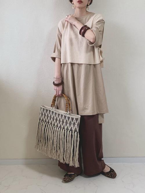 Tシャツワンピにパンツやレギンスを合わせるのが定番コーデ。特に2019年は裾が少し広がったリブニットパンツがおすすめ!