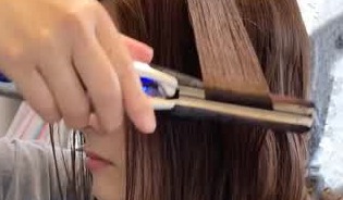 毛束を薄めに取ります。手首のスナップをきかせてアイロンを上下に動かし、毛先に向かってスライドしていきましょう。