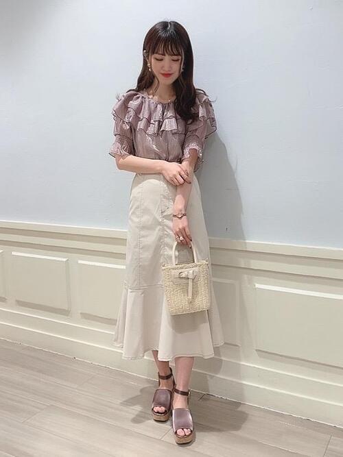 上半身はフリルのブラウスでボリュームを出しながらも、シアー感のあるアイテムを選んで上品に。
