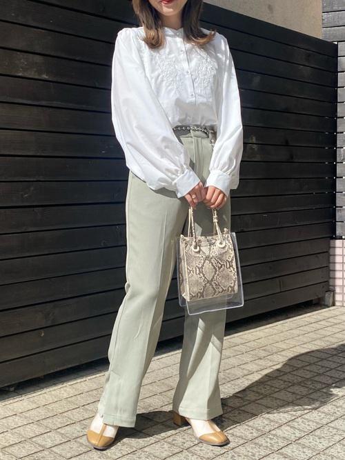 シンプルな白ブラウスでも、胸元に刺繍があるデザインなら上半身に印象づけることができるので◎
