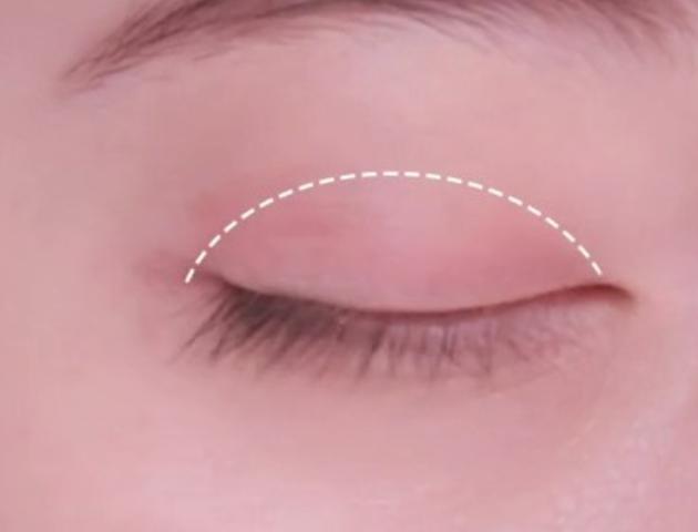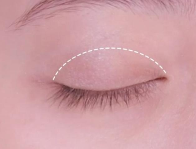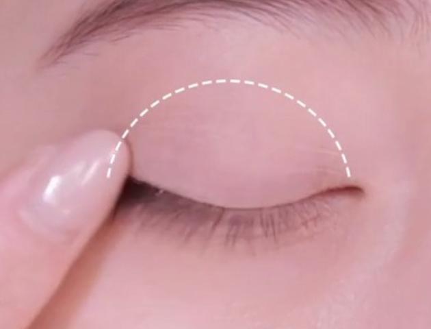 明るいベージュを指に取り、上下まぶたに塗ります。